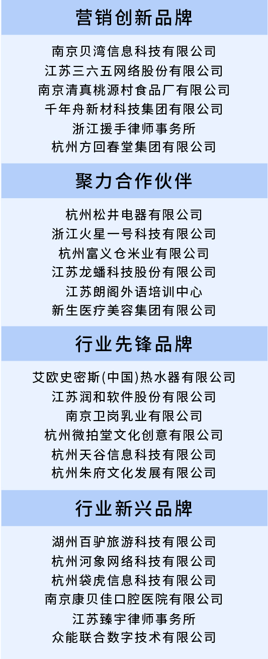 在百度品牌之夜活動上,根據數據趨勢、百度搜索熱度排名、行業(yè)影響,分別發(fā)布了營銷創(chuàng)新品牌、聚力合作伙伴、行業(yè)先鋒品牌、行業(yè)新興品牌等獎項,24家江浙品牌企業(yè)榮獲獎項,以鼓勵江浙品牌企業(yè)長遠發(fā)展。